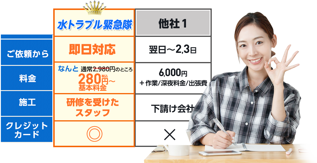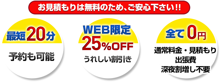 休日や深夜の割増料金についても一切不要でご対応しています。初めての方もお気軽にご連絡ください。